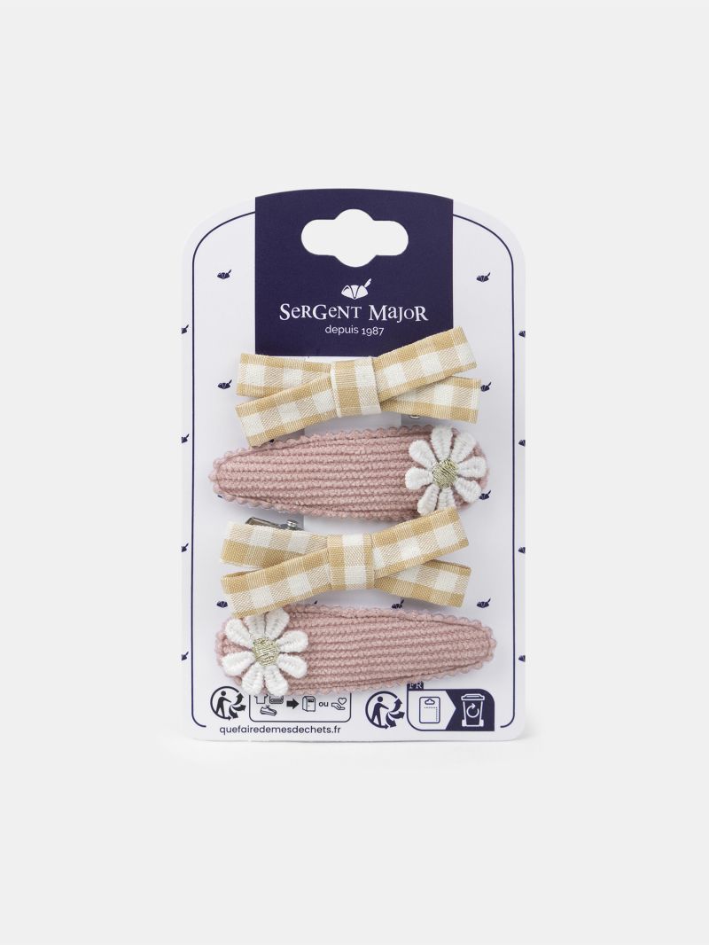 - 2 броя фиби за коса с покритие от мека мъхеста материя в топъл розов цвят с мотив на цвете