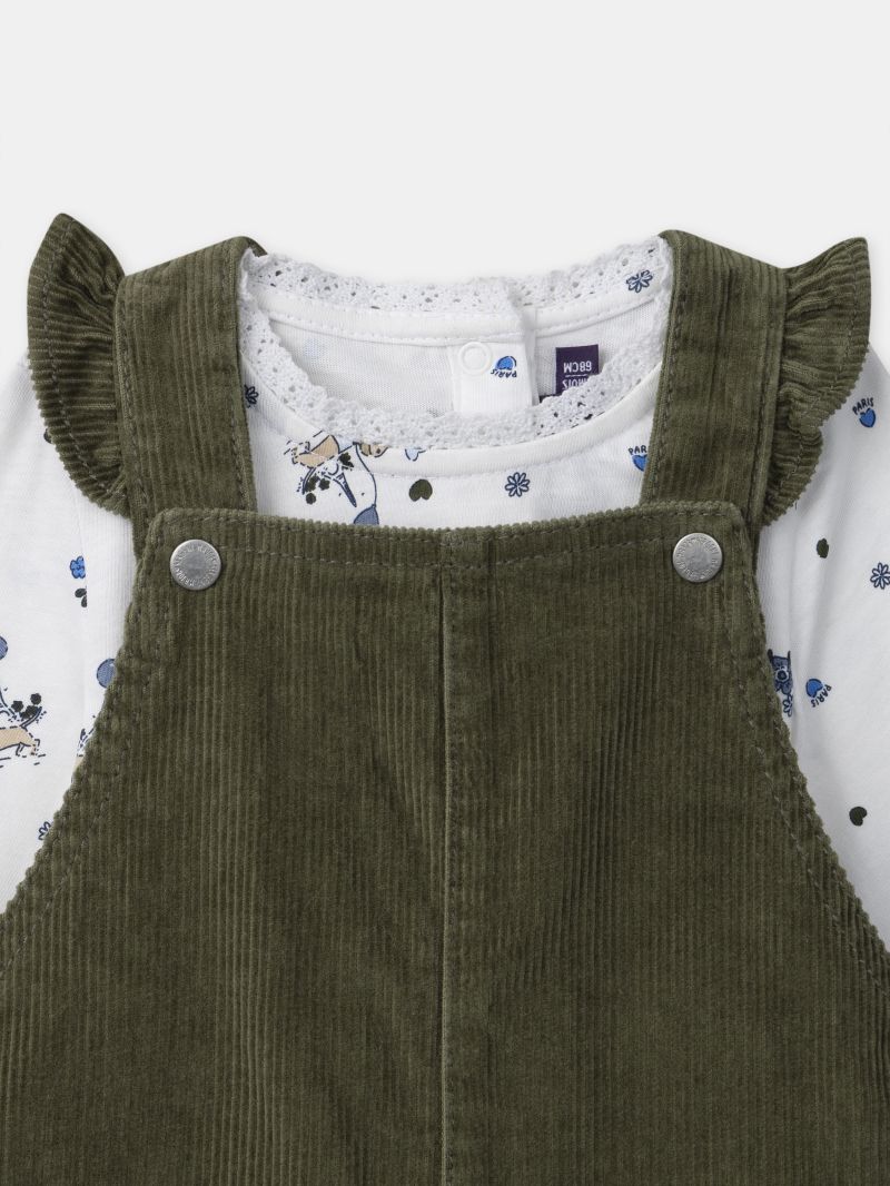 Този очарователен комплект съчетава зелен дънков сукман, с игриви джобчета с личице на катеричка и . Воланите на презрамките добавят сладък и стилен акцент. Съчетан с бони в основен екрю цвят и флорален десен, този комплект се превръща в идеалният избор на всяко малко момиченце. Визията е допълнена с изчистен чорапогащник, осигуряващ максимален комфорт и свобода на движение, правейки го идеален избор както за игри, така и за специални моменти.