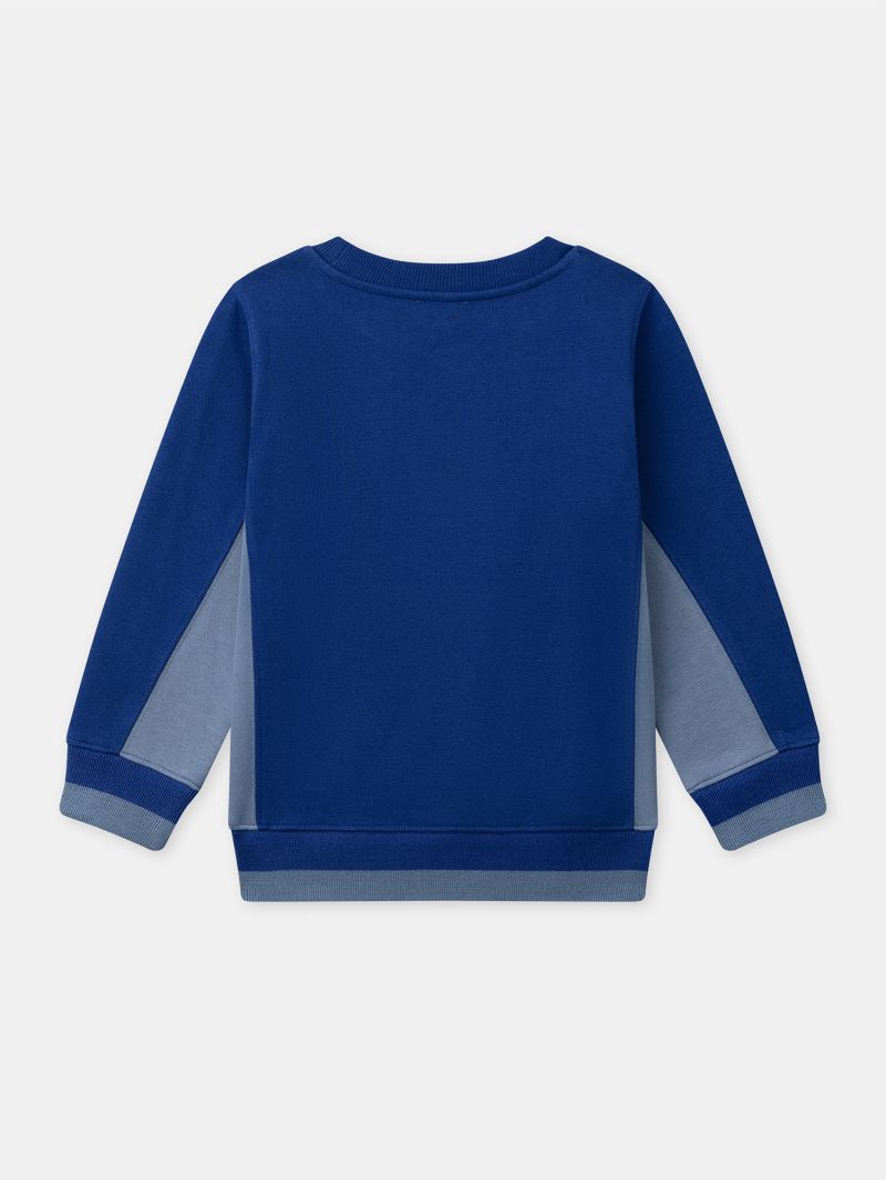 Този суичър в син цвят е стилен, практичен и идеалният спътник за всяко момче, готово да се справи с всички приключения по всяко време. Декориран отпред със забавен мотив на френски булдог, който кара скейтборд, който придава на модела игривост и индивидуален стил. Дългите ръкави, облото деколте, рипсените маншети и талия добавят към дрехата допълнителен комфорт и стабилност. Съчетайте този суичър с панталон за ултра-модерен и небрежен външен вид.