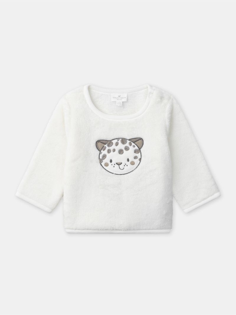 Представяме ви топъл и удобен комплект, който се отличава с пухкаво горнище със забавен мотив с глава леопард в съчетание с панталон в основен екрю цвят.