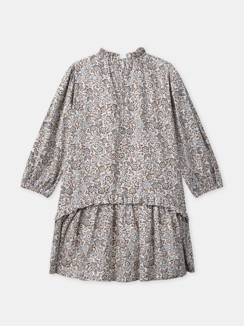 Тази очарователна рокля с флорален десен е изискан и нежен избор за малки момичета. Воланите в долната част на роклята придават лекота и красиви движения при всяка стъпка. Ластичните ефектни шевове на деколтето осигуряват перфектно и елегантно прилягане, а еластичните ръкави в долната част добавят допълнителен комфорт. С мека памучна подплата, тази рокля гарантира максимален комфорт и е идеална за всички специални поводи и слънчеви дни.