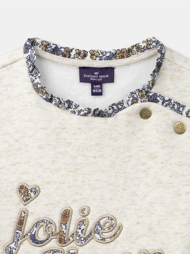 - Кръгло деколте с елегантна яка с волан с флорален десен