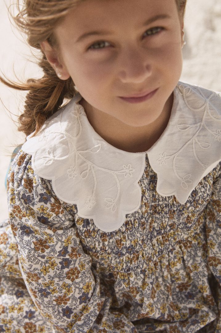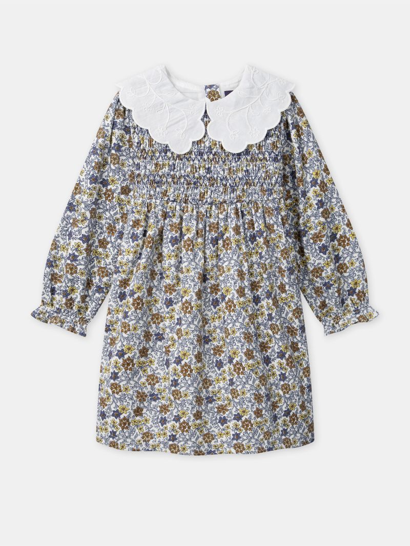 Тази рокля с флорален десен, с яка Claudine е идеален избор за стилни малки дами през цялата година. Изработена от мека памучна материя, тя предлага изключителен комфорт и издръжливост. Яката с нежна английска бродерия и еластичните маншети придават изисканост, докато широкия волан в долната част добавя игрив и елегантен акцент. Перфектен избор за очарователен външен вид.