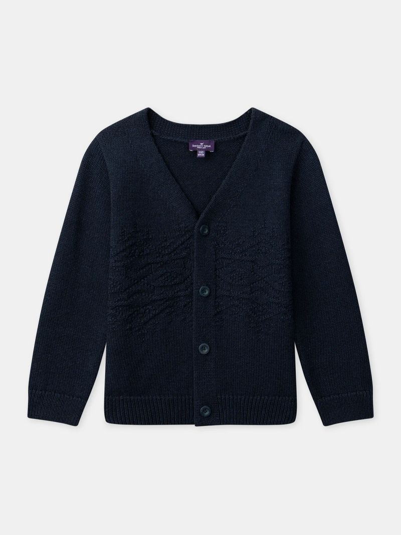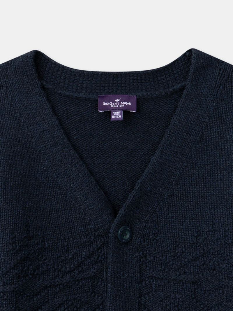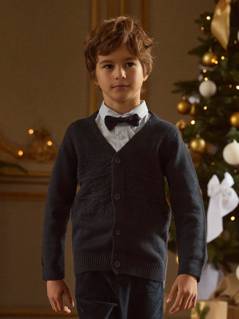 Създаден за студените дни, този елек е идеален за детското ежедневие през по-хладните месеци. Жакардовата плетка с вълна осигурява топлина и комфорт. Предното закопчаване с копчета и морските нюанси добавят празнично и стилно излъчване.