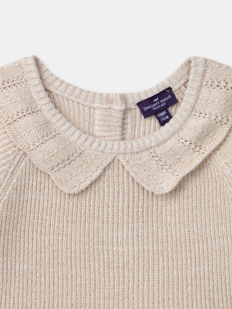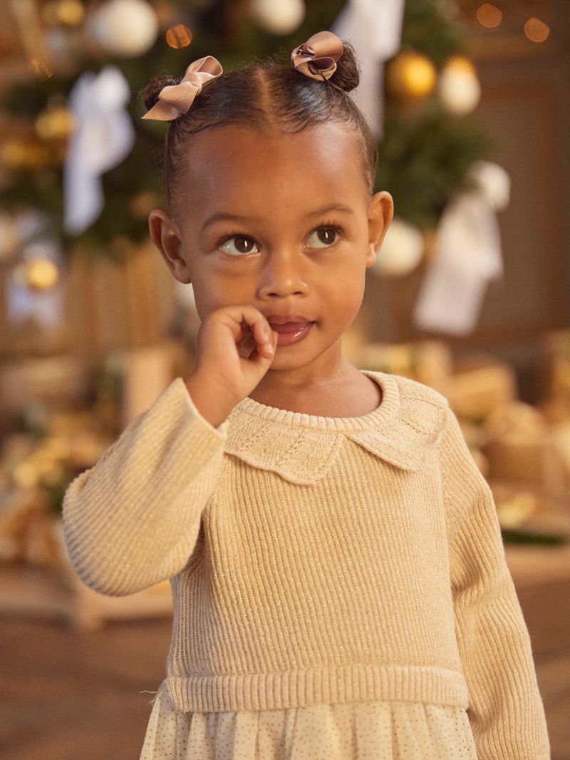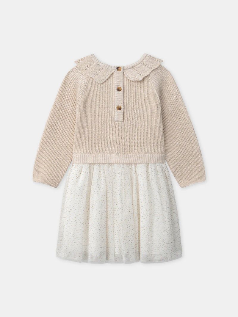Перфектна за зимните празници, тази рокля съчетава комфорт и изящество. Плетената горна част със златиста нишка и тюлената долна част със златни пайети създават изискан контраст. Закопчаването с копчета на гърба улеснява обличането.