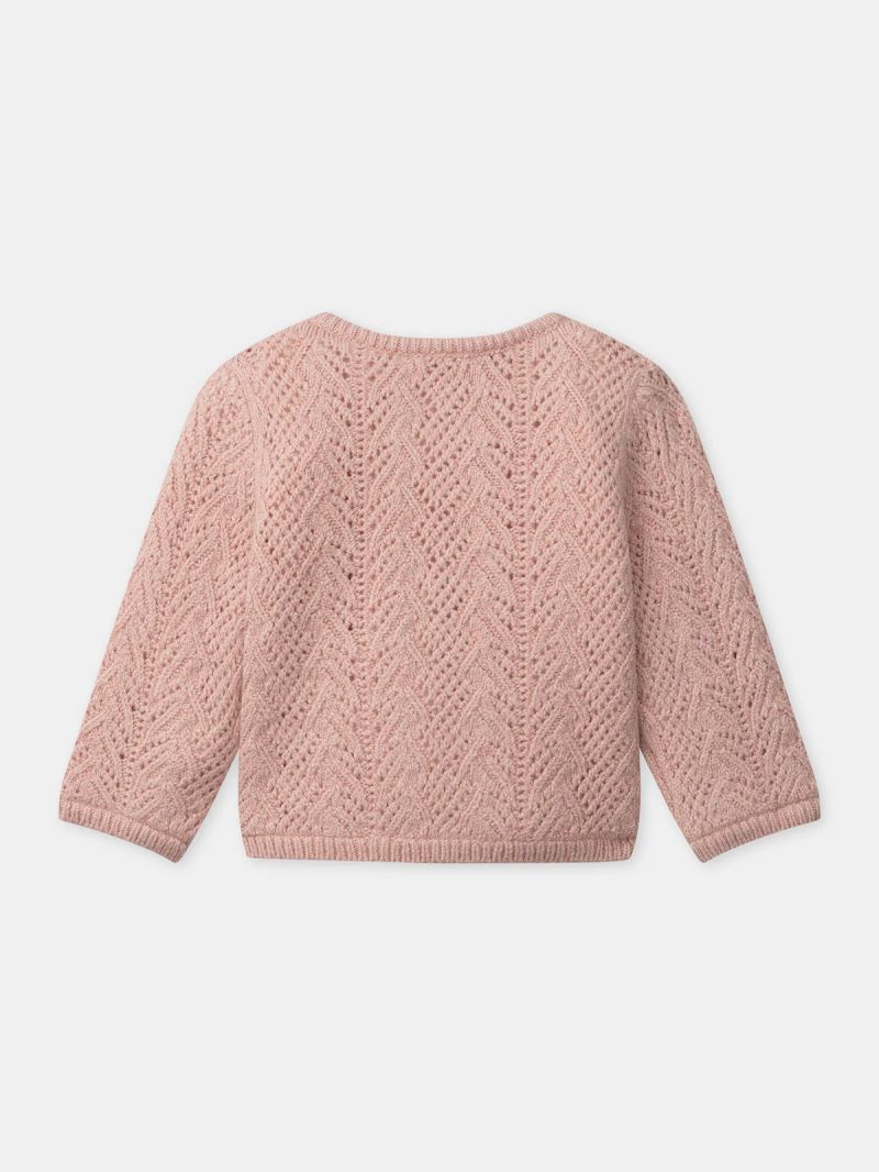 Тази жилетка обгръща децата в топлина и мекота през зимните дни. Изработена от фина ажурна плетка с пухкава вътрешна подплата, тя се закопчава лесно с копчета по цялата дължина. Нежният розов цвят ѝ придава изискан и уютен характер.