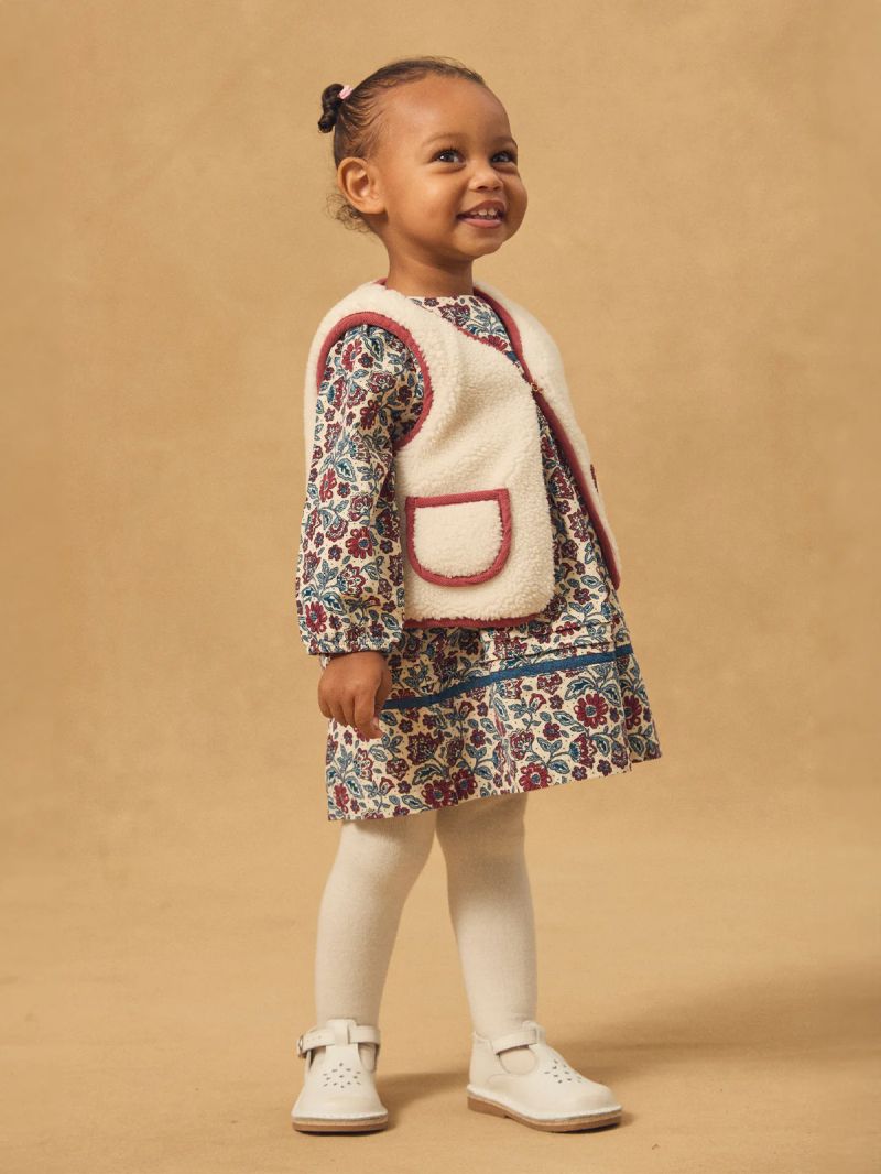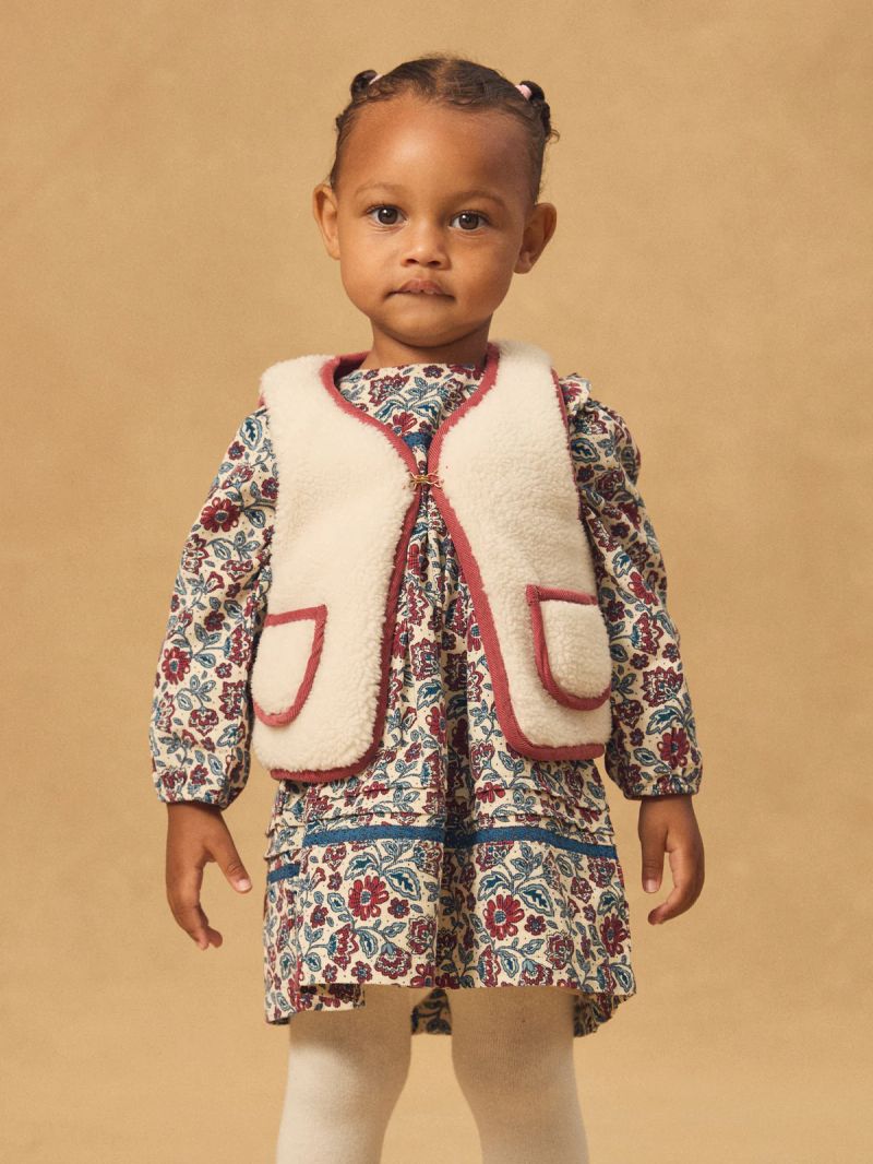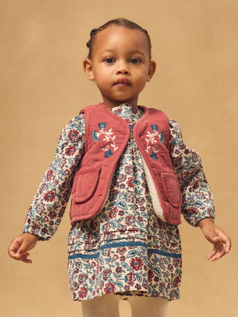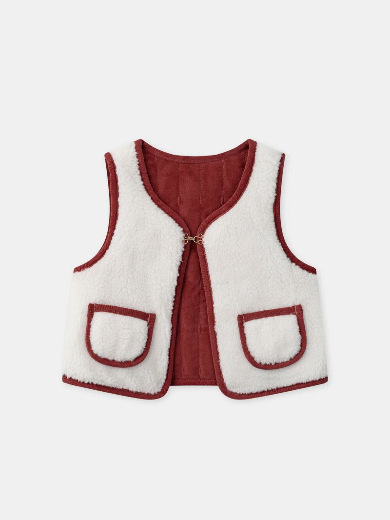 Този елек е създаден за зимата и помага на децата да стоят топли. Той е двулицев, което означава, че може да се носи по два различни начина. Има малки цветни бродерии и контрастни кантове, които го правят още по-сладък.