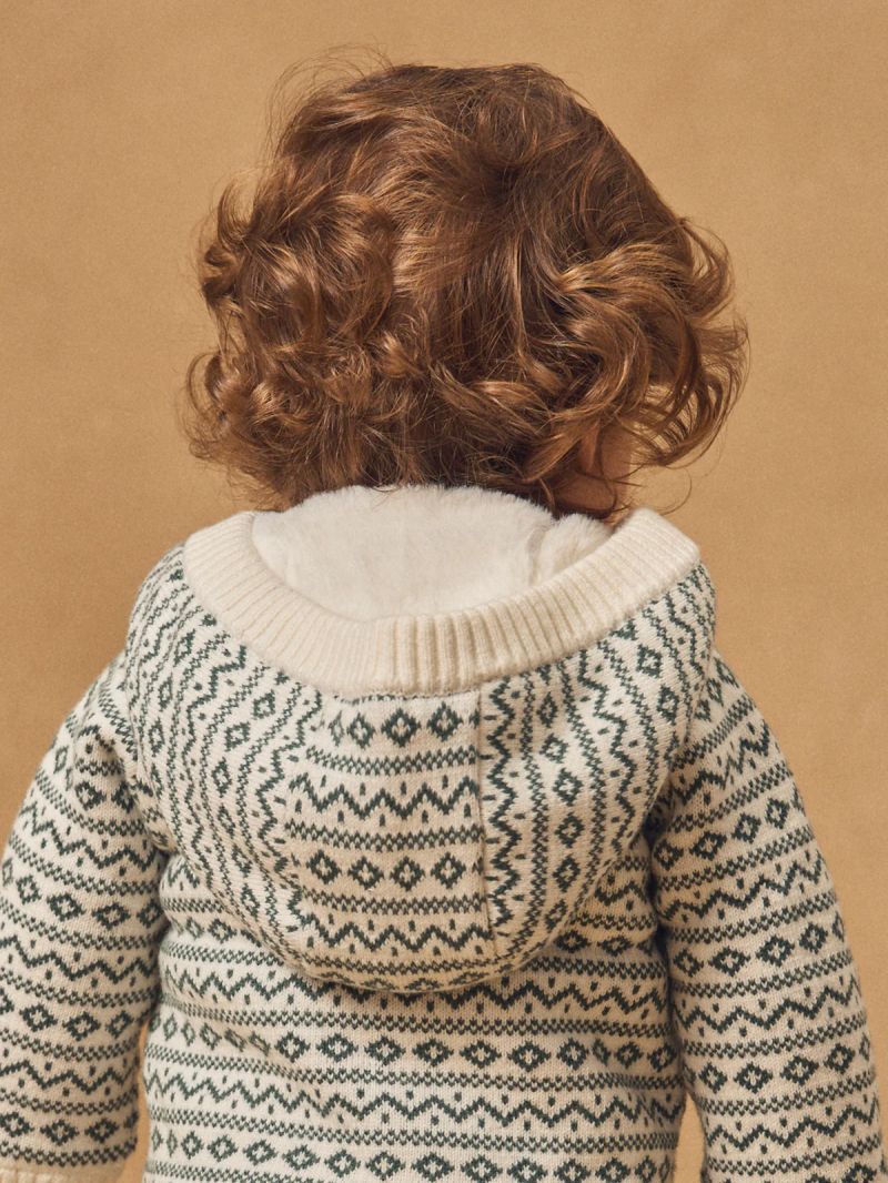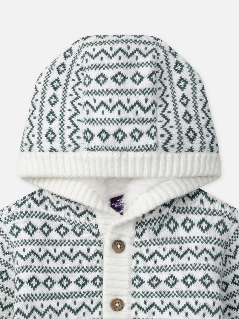 Тази жилетка е създадена за зимата и държи децата топли. Изработена е от плетена материя и е подплатена с пухкава подплата. Закопчава се изцяло с копчета отпред. Зелените и екрю геометрични мотиви ѝ придават уютно „планинско“ излъчване.